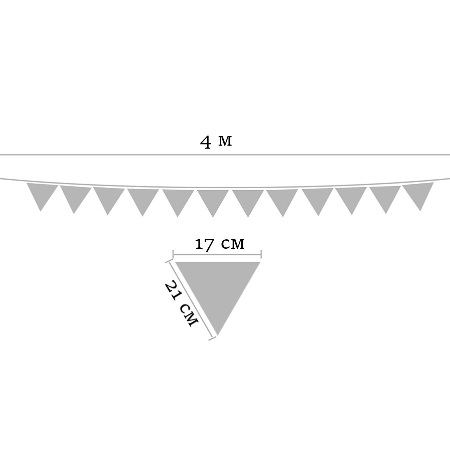 Гирлянда состоит из 12 флажков, расстояние между флажками 6 см, общая длина составляет 4 м.